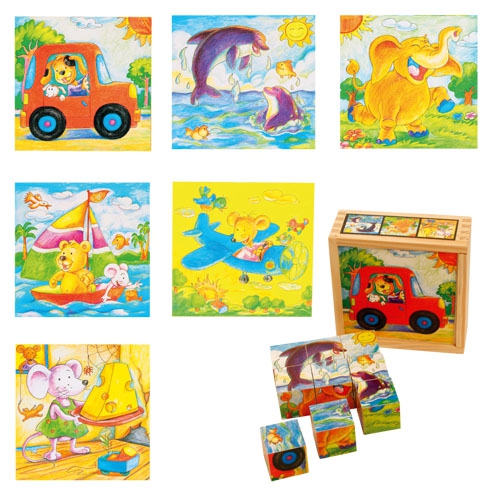 Dětské dřevěné kostky obsahují devět kostiček, ze kterých si děti postaví šest různých obrázků.