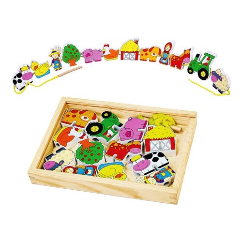 zrychlené vrácení a reklamaceNavlékací dřevěna sada s korálky. Korálky mají podobu zvířátek, keřů, farmářů či traktorů. Korálky mají velké díry, které se pomocí dřevěné tyčky na krajích provázku snadno provléknou.