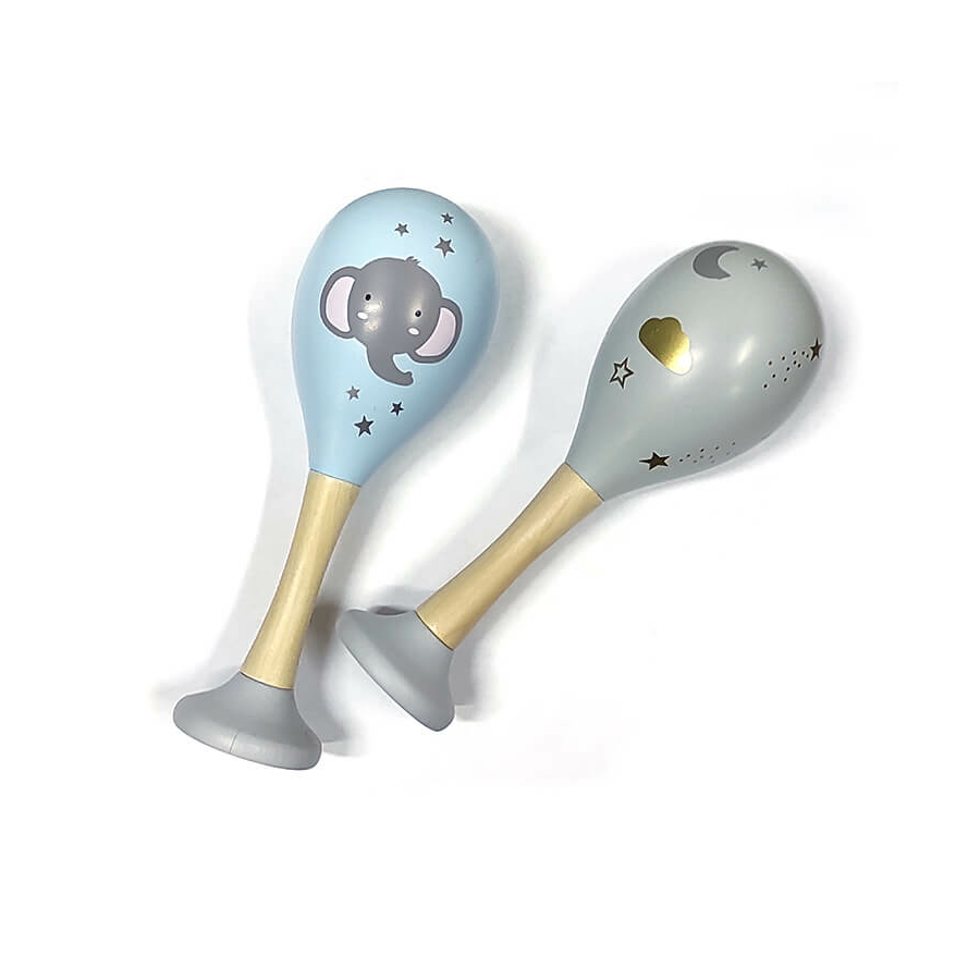 Sada dvou dětských dřevěných rumba koulí v šedé a modré barvě s motivem slůněte.