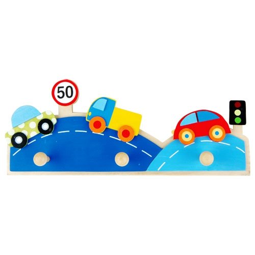 Dětský dřevěný věšák s motivem silnice.