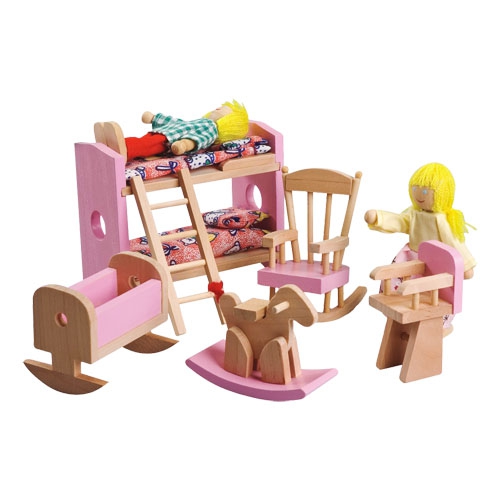 zrychlené vrácení a reklamaceStylový, přitom minimalistický, dřevěný nábytek promění každý domeček pro panenky v útulný domov. Sada obsahuje palandu, houpací křeslo, židličku, kolébku a houpacího koníka - roztomilý dětský pokoj ideální pro odpolední hry.
