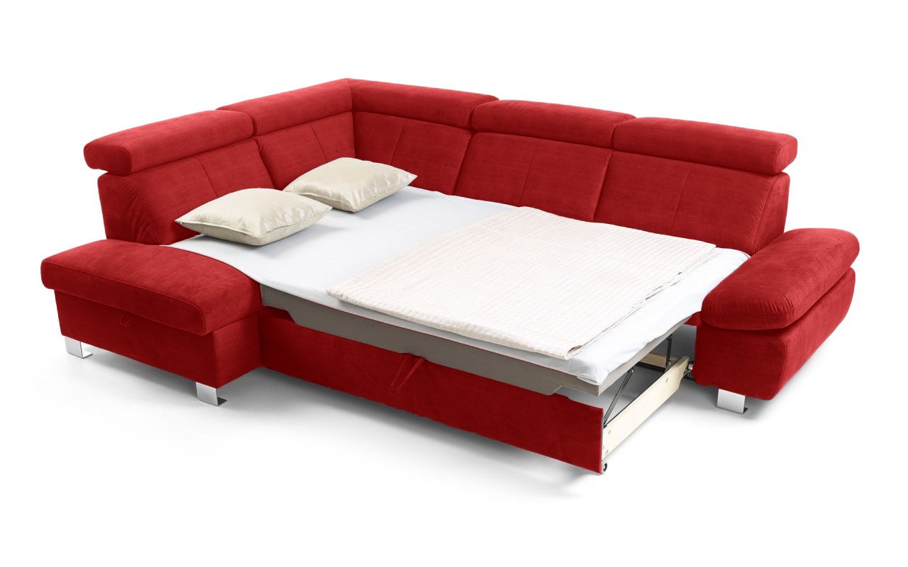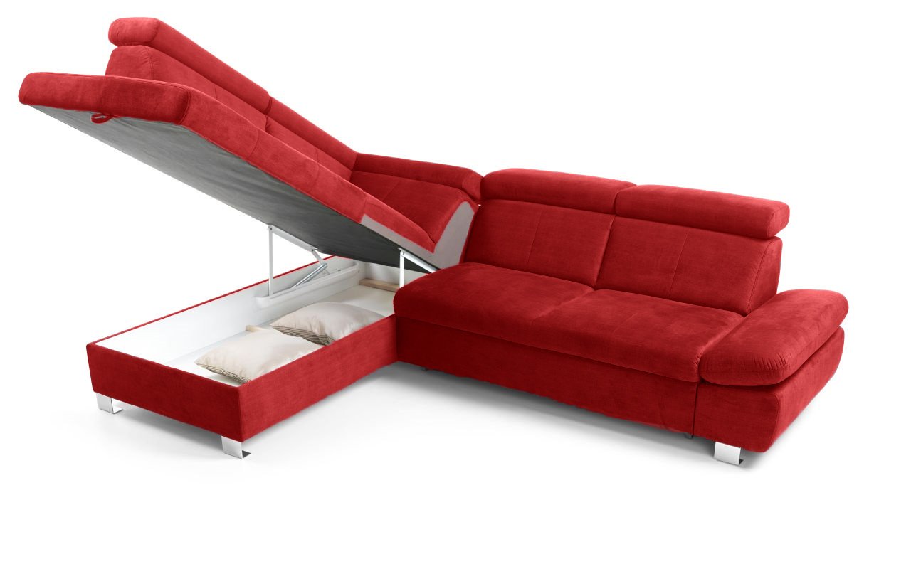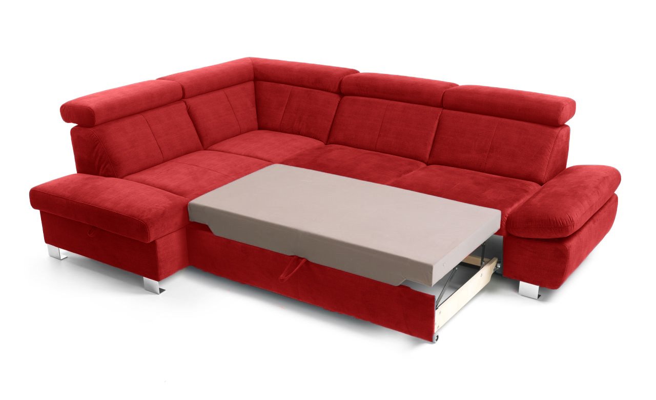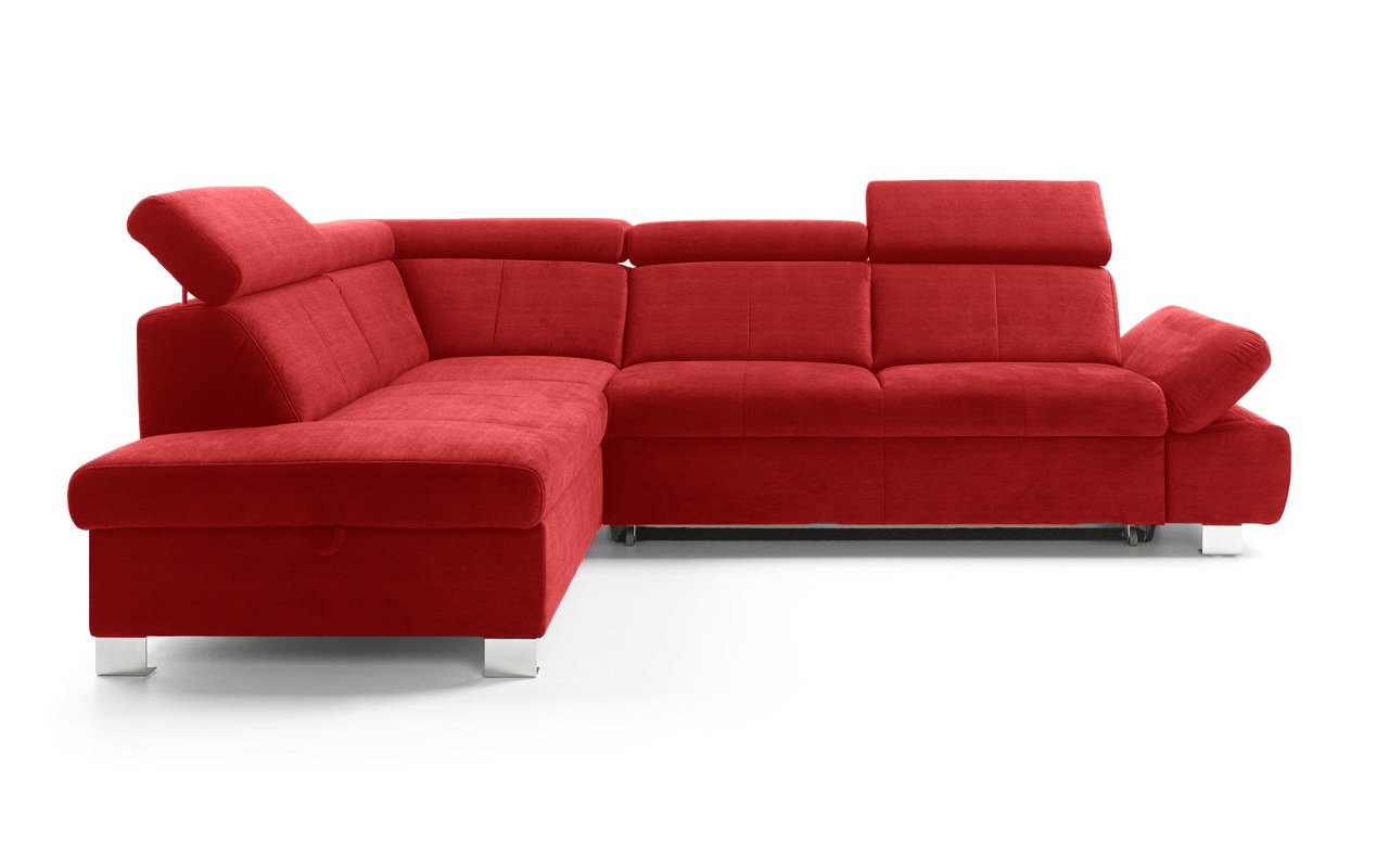 Módní rohová sedací souprava vyniká zdařilým designem i polohovatelnými opěrkami hlavy - jejich nastavení do různých poloh zajistí komfortní opření zad, a díky možnosti výběru jejich sklonu si tak můžete přizpůsobit styl sezení podle vaší individuální potřeby. Stejně tak jistě oceníte její praktičnost. Na eleganci tomuto celku dodávají chromové nožičky. Přímo pod sedákem se nachází rozkládací prostorné lůžko o rozměru 128 cm x 193 cm. Stojíte-li právě naproti pohovce, potom se po vaší pravé ruce nachází podsedák, jenž v sobě navíc ukrývá velkorysý úložný prostor, který je snadno přístupný díky vyklápěcí konstrukci.