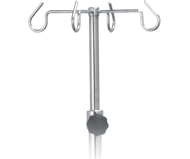 Infuzní stojan teleskopický s kovovými háčky. Zasouvá se do držáku na hrazdu v hlavové části lůžka.