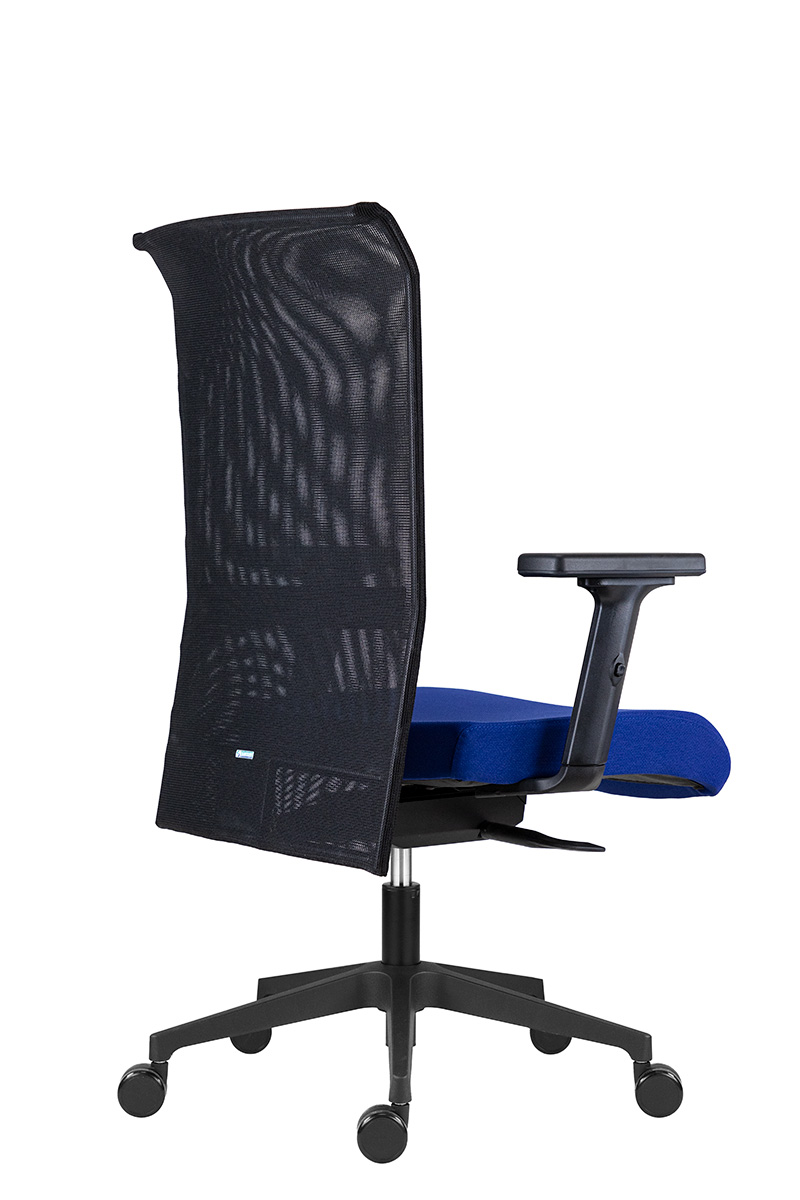 Čalouněný sedák, synchronní mechanismus s čtyřnásobnou aretací, automatickým nastavením síly protiváhy a nastavením hloubky sedáku, kolečka pro měkké podlahy, nosnost 150 kg, záruka 60 měsíců, český výrobek.