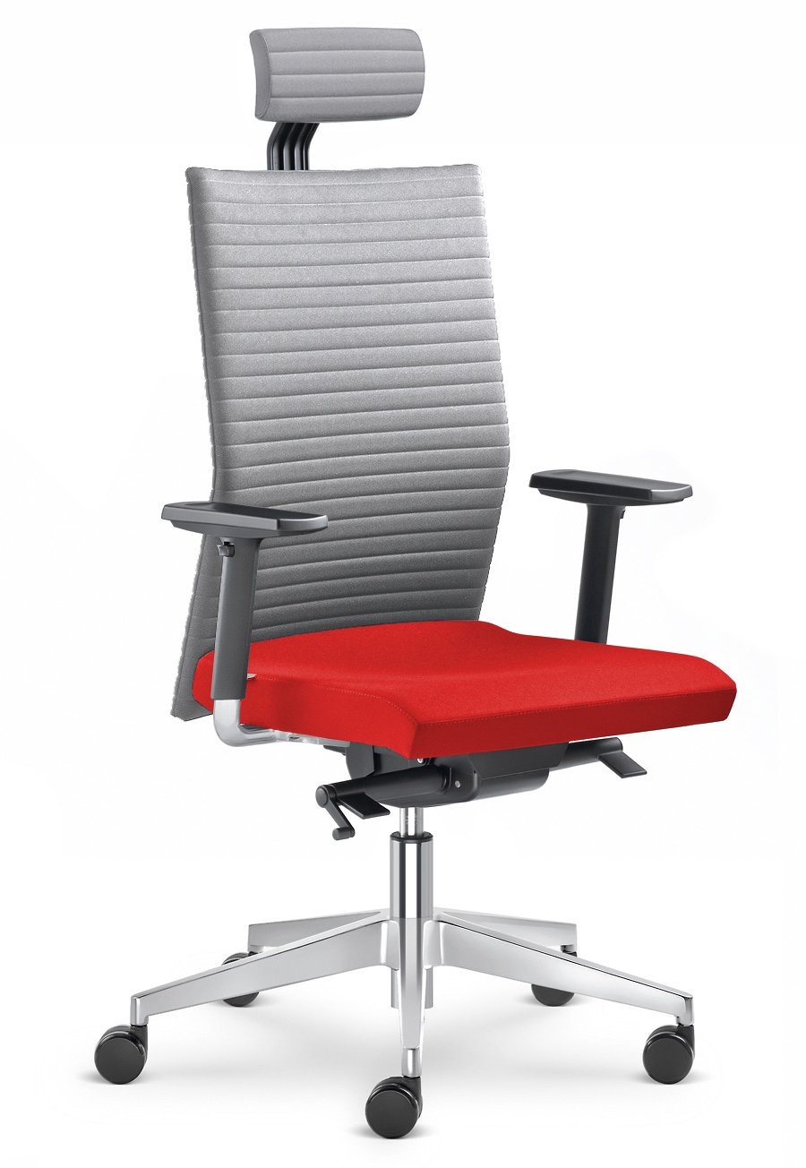 Židle ELEMENT 430-SYS-HO-F40-N6 Výškově stavitelná a naklopitelná opěrka hlavy, vysoký opěrák. Synchronní mechanika SYS s bočním nastavením tuhosti opěradla. Plynový píst, leštěný hliníkový kříž, kolečka 60 mm. Výškově stavitelné područky BR207.