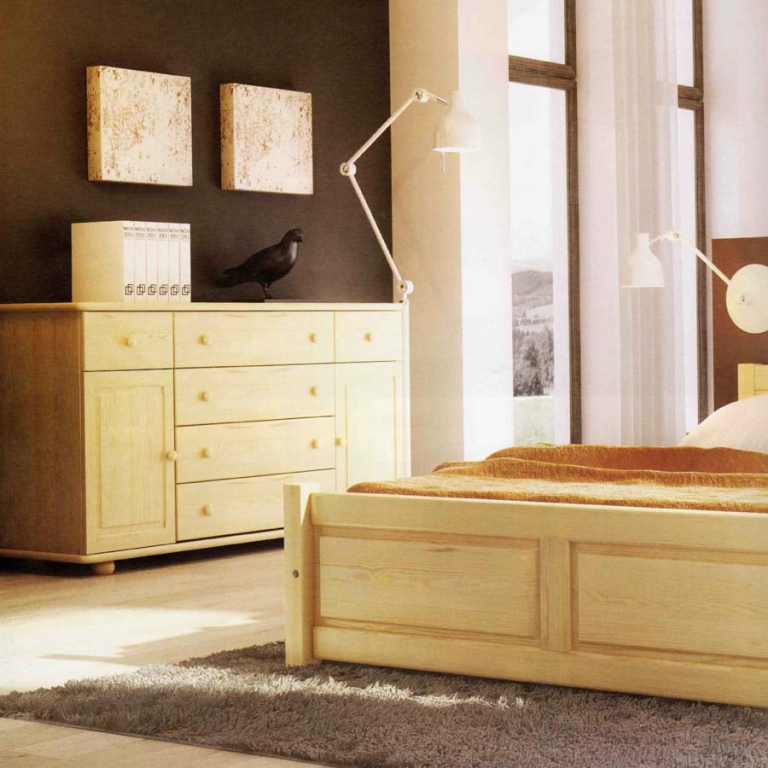 Komoda je vyrobena z masivní přírodní borovice a je povrchově upravená lakováním. Zásuvky jsou dřevěné na kolečkových výsuvech s 2/3 otevřením. U dveří použity kvalitní kovové panty s úhlem otevření 110°.