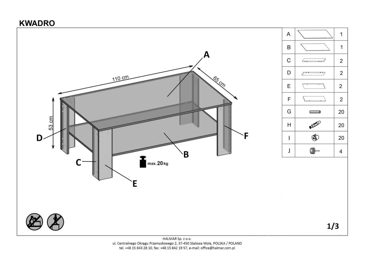 Obdelníkový konferenční stolek Kwadro je vyrobený z laminovaných MDF desek. Obsahuje i odkládací polici, která má nosnost 20kg. Konferenční stolky dotváří atmosféru interiéru a jsou nedílnou sočástí každého obývacího pokoje. Konferenční stolek Kwadro dodá svým klasickým designem Vašemu bydlení moderní styl. Dekorace nejsou součástí balení. Dodáváme v demontu.