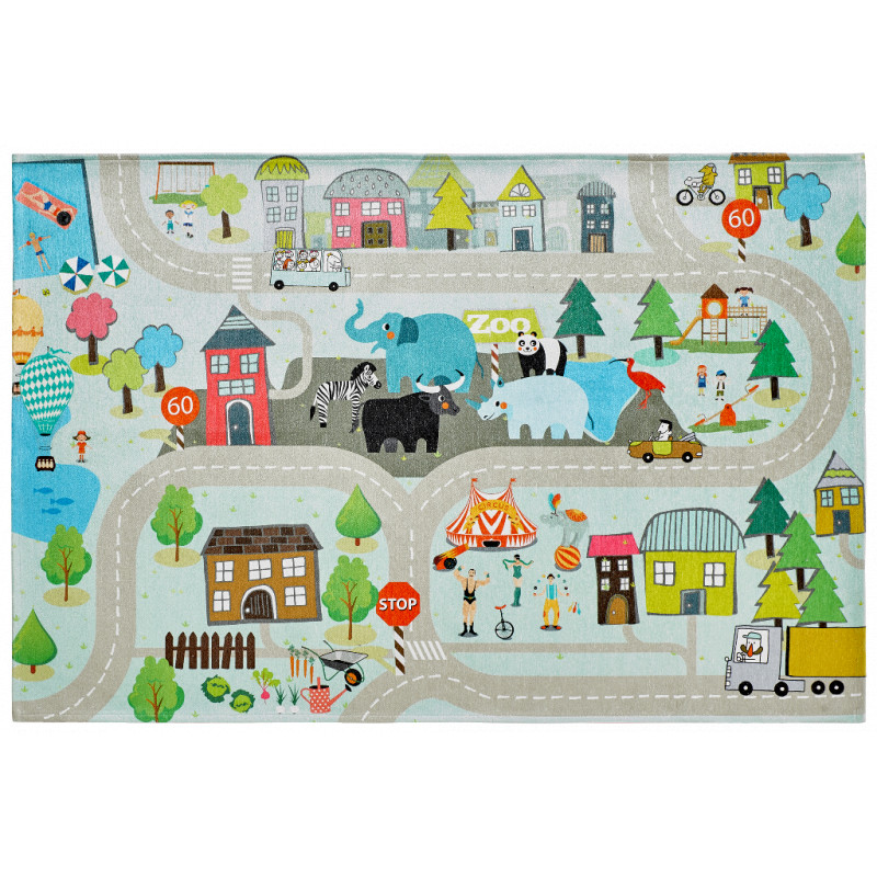 Polyester je navíc jemný materiál, proto ani smyčkový koberec není tvrdý. Zkrátka ideální koberec na dětské hraní. Pro děti, které mají rády zvířátka nebo silnice se jedná o skvělý dárek. Výška vlasu: 0 mm.