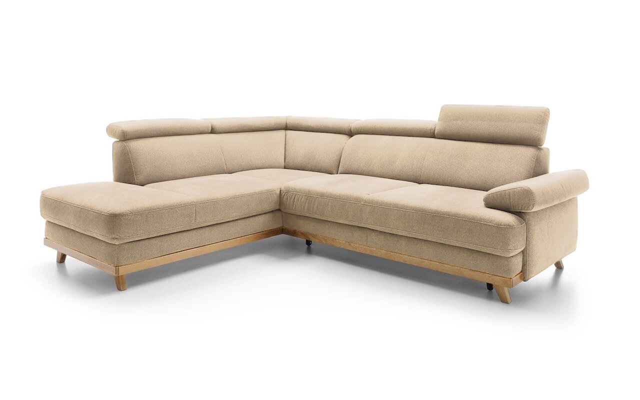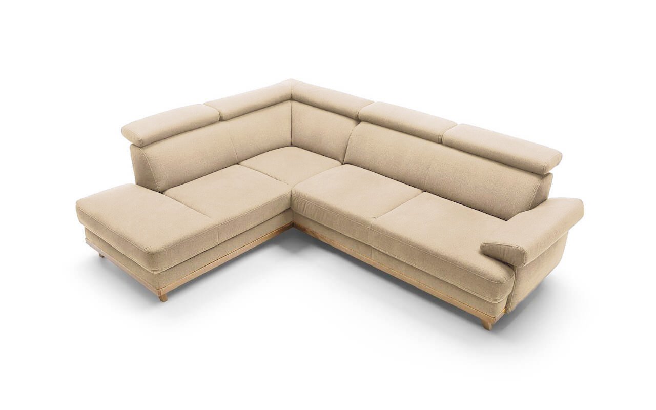 Elegantní rohová sedací souprava s komfortně měkkým sezením a polohovatelnými opěrkami hlavy nabízí skvělé pohodlí i praktičnost. Dřevěné nožičky dodáváme v různých odstínech. Vlastní výběr jejich moření uveďte do poznámky na konci objednávky.