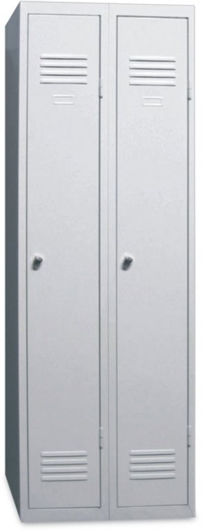 • Dvoudveřová kovová šatní skříňka na soklu.