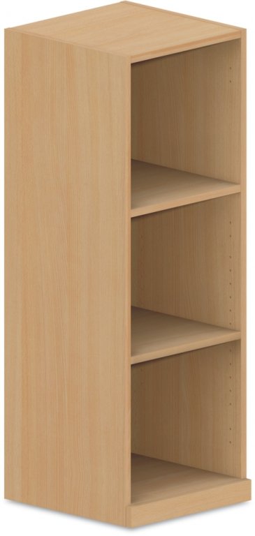 Policová skříň z laminotřískové desky s pevnými oboustranně pohledovými zády o tloušťce 18 mm, olepeno hranou ABS 1 mm. Sokl o výšce 50 mm naložený na korpusu.