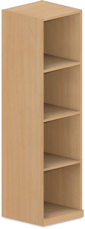 Policová skříň z laminotřískové desky s pevnými oboustranně pohledovými zády o tloušťce 18 mm, olepeno hranou ABS 1 mm. Sokl o výšce 50 mm naložený na korpusu.
