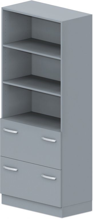 Policové skříně z laminotřískové desky s pevnými oboustranně pohledovými zády o tloušťce 18 mm. Sokl o výšce 100 mm olepen hranou ABS 2 mm, ostatní hrany olepeny ABS 0,5 mm. Skříně mají vždy ve výšce 825 mm a 1175 mm pevnou polici pro zajištění maximální tuhosti konstrukce. Ostatní police volné, přestavitelné. Skříně vybaveny stavitelnými kluzáky pro možnost vyrovnání podlahové nerovnosti.