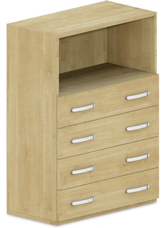 Skříň policová, zásuvky/niky 100% výsuv, max. zátěž na jednu zásuvku 15 kg Skříně z laminotřískové desky s pevnými oboustranně pohledovými zády o tloušťce 18 mm. Sokl o výšce 25 mm olepen hranou ABS 2 mm, ostatní hrany olepeny ABS 0,5 mm. Zásuvky s kovovými výsuvy. Skříně mají vždy ve výšce 750 a 1100 mm pevnou polici pro zajištění maximální tuhosti konstrukce. Ostatní police volné, přestavitelné. Úchytky kovové. Skříně vybaveny stavitelnými kluzáky pro možnost vyrovnání podlahové nerovnosti. Expedováno ve smontovaném stavu.