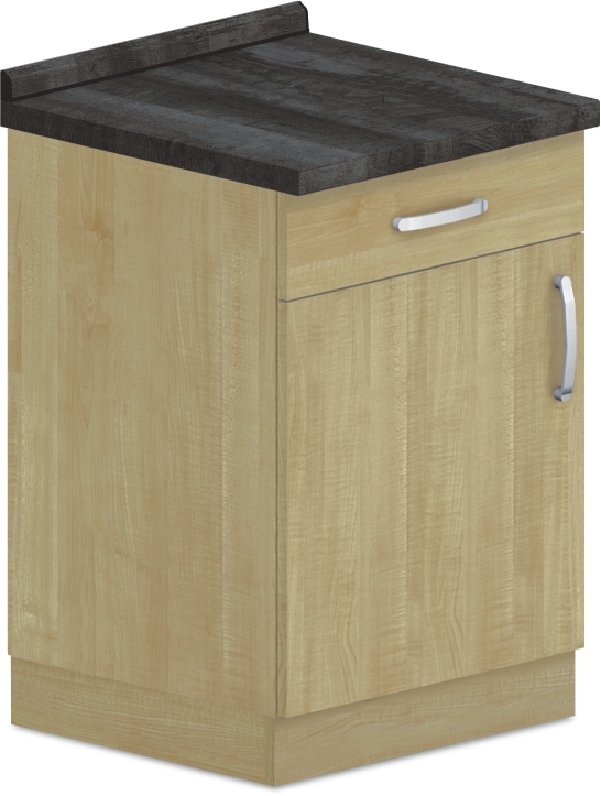 Levá. Se zásuvkou a vnitřní policí. Skříně se soklem o výšce 100 mm a dveře vyrobené z laminotřískové desky o tloušťce 18 mm a olepeny hranou ABS, u dveří o síle 2 mm, ostatní hrany ABS 0,5 mm. Záda skříně HDF 3 mm. Součástí ceny skříně v základu pracovní deska o tloušťce 28 mm a zadní krycí lišta. Pracovní deska vždy v jednom kuse na celou sestavu skříní. Sokl se silikonovou těsnící lištou proti zatékání. Hrany skříně olepeny speciální polyuretanovou technologií pro zvýšení odolnosti proti vodě, proto na všechny naše skříně poskytujeme záruku 5 let. Úchytky kovové. Skříně vybaveny stavitelnými kluzáky pro možnost vyrovnání podlahové nerovnosti. Expedováno ve smontovaném stavu.   Volbu provedení pracovní desky uveďte do poznámek při dokončení objednávky. Pokud tak neuděláte, automaticky zůstává provedení viz fotografie produktu.