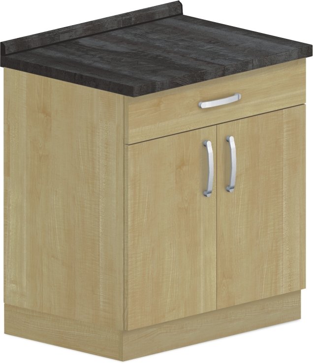 Se zásuvkou a vnitřní policí. Skříně se soklem o výšce 100 mm a dveře vyrobené z laminotřískové desky o tloušťce 18 mm a olepeny hranou ABS, u dveří o síle 2 mm, ostatní hrany ABS 0,5 mm. Záda skříně HDF 3 mm. Součástí ceny skříně v základu pracovní deska o tloušťce 28 mm a zadní krycí lišta. Pracovní deska vždy v jednom kuse na celou sestavu skříní. Sokl se silikonovou těsnící lištou proti zatékání. Hrany skříně olepeny speciální polyuretanovou technologií pro zvýšení odolnosti proti vodě, proto na všechny naše skříně poskytujeme záruku 5 let. Úchytky kovové. Skříně vybaveny stavitelnými kluzáky pro možnost vyrovnání podlahové nerovnosti. Expedováno ve smontovaném stavu. Volbu provedení pracovní desky uveďte do poznámek při dokončení objednávky. Pokud tak neuděláte, automaticky zůstává provedení viz fotografie produktu.