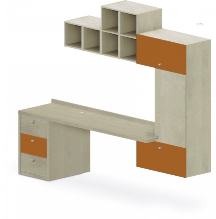 Pravá. Volitelná barva dvířek. Nápaditá, hravá, veselá a přitom praktická stolová sestava v materiálu laminotřískové desky olepené hranou ABS 1 mm. Tloušťka materiálu pracovní desky 36 mm pro zajištění maximální pevnosti a odolnosti, ostatní 18 mm. Sestavu lze kotvit na sádrokartonovou stěnu.
