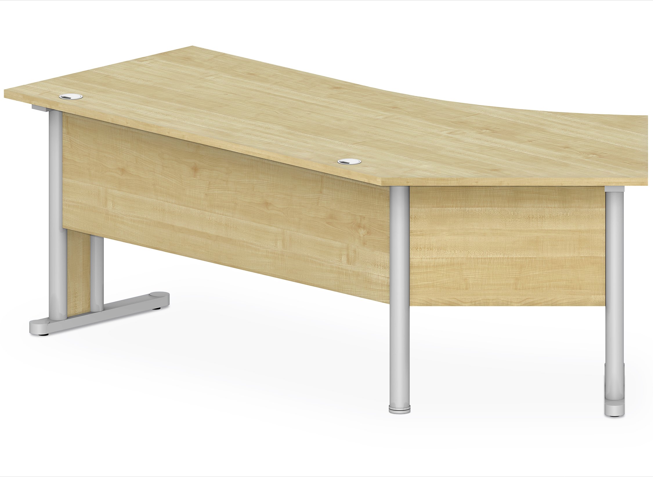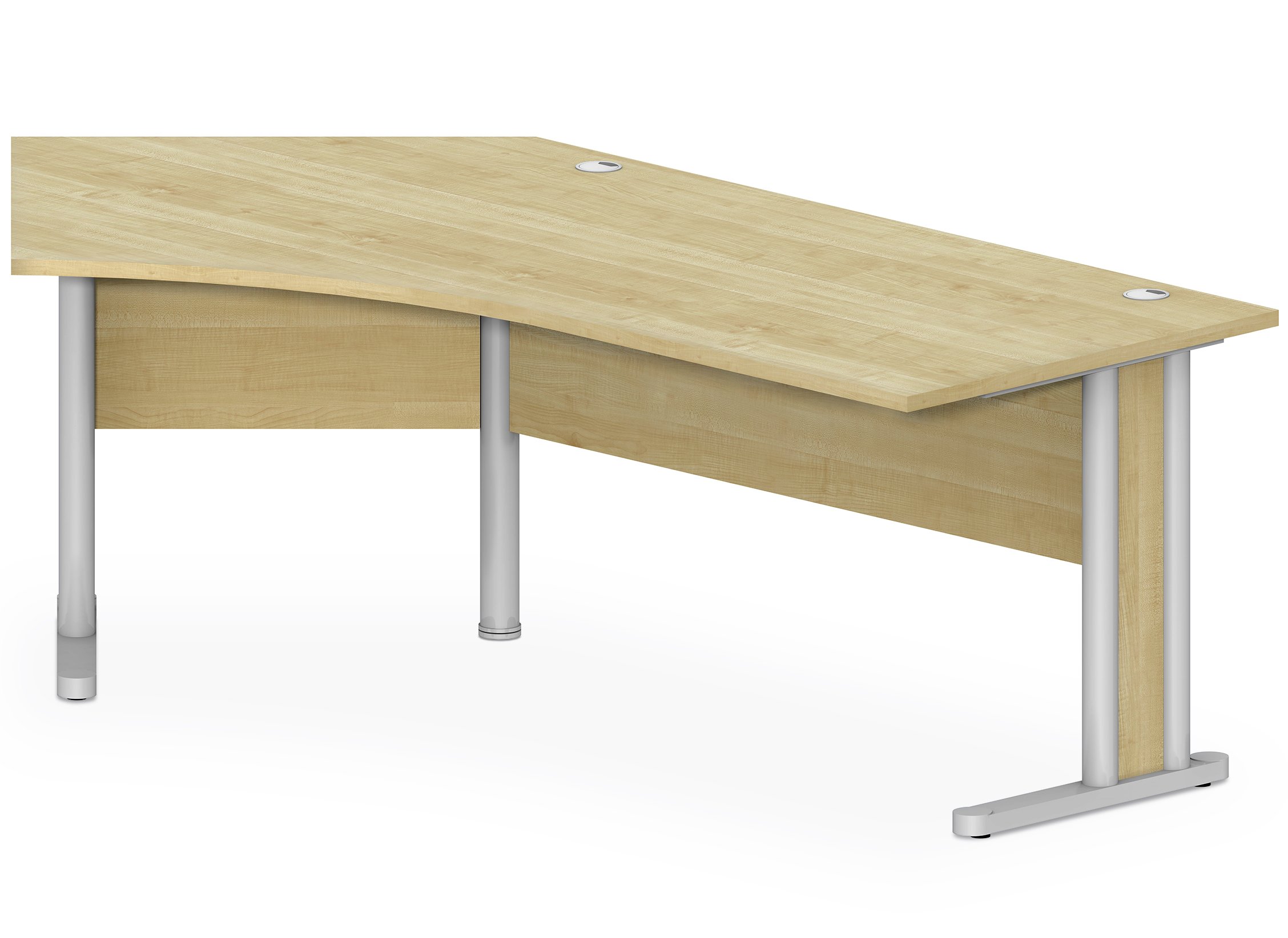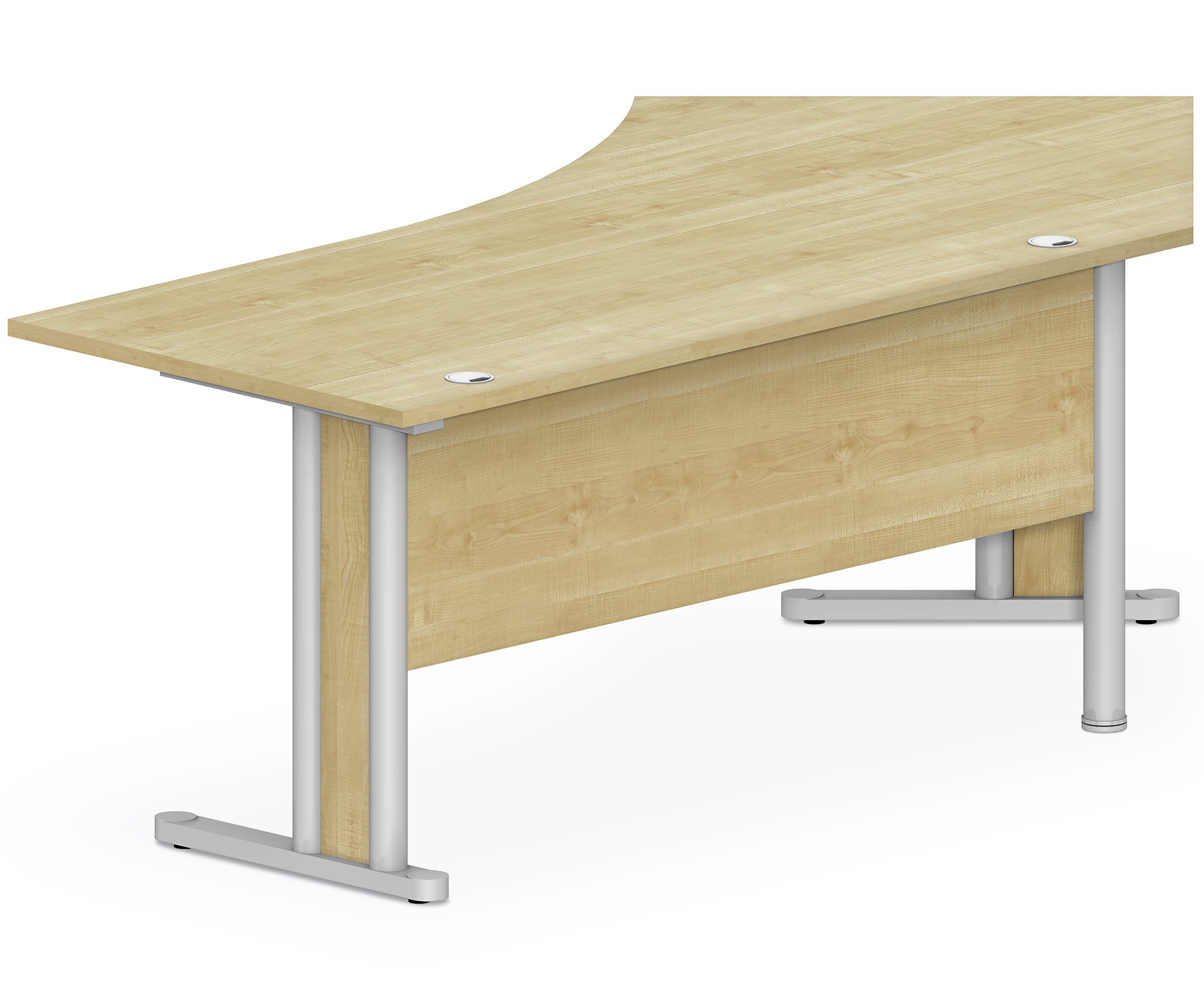 Kovová podnož s deskovou výplní bočnic i zádovou clonou 400 mm. Stolová deska tloušťky 25 mm, hrana ABS 2 mm. Součástí stolů jsou průchodky na kabely.