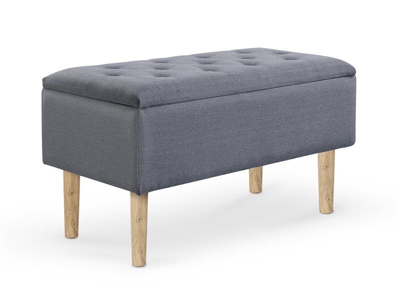 Taburet je čalouněn příjemnou látkou v šedé barvě a nohy jsou vyrobeny z přírodního dřeva. Sedák je otevírací a uvnitř je vybaven úložným prostorem.