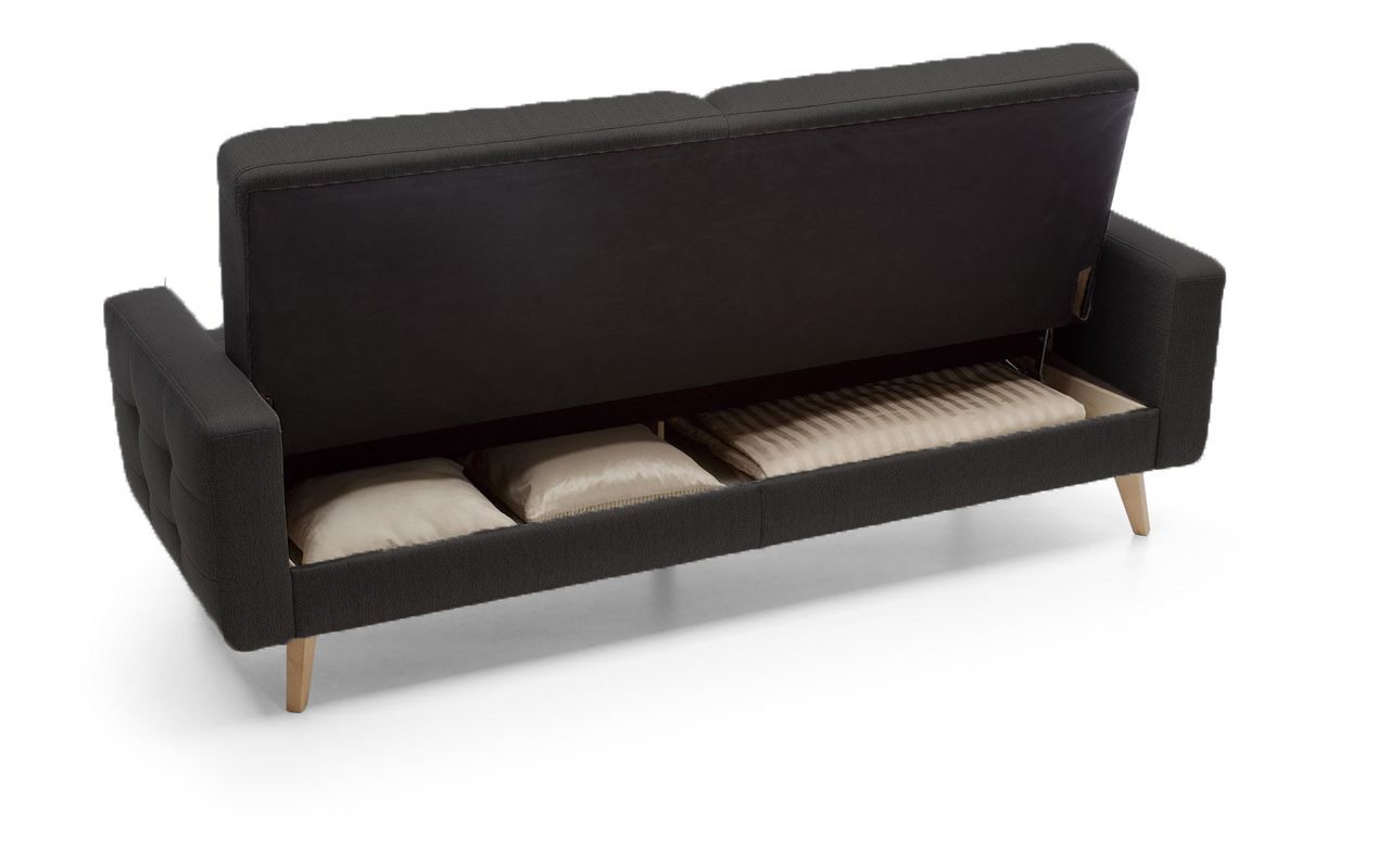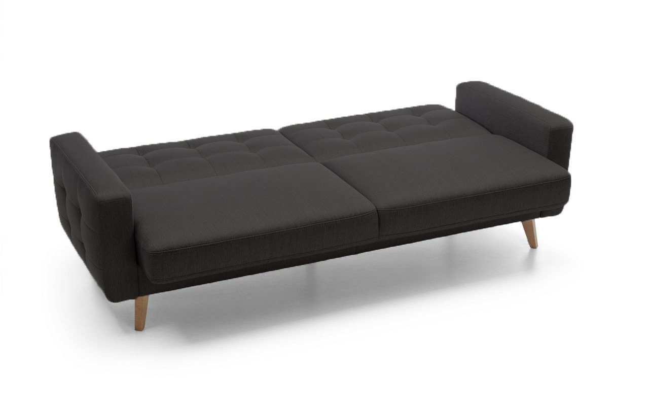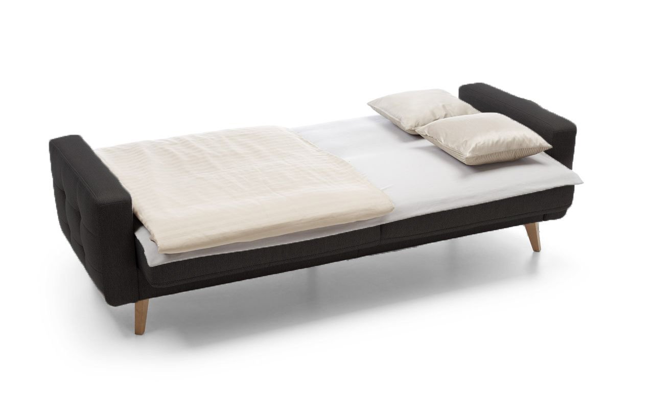 • Čalouněná pohovka v oblíbeném skandinávském stylu vytvoří příjemné pohodlí v každém obývacím pokoji. Elegantní zaoblené područky, pohodlené opěrky zad s dekorativním proševem a masivní dřevěné nohy (jejichž moření si můžete zvolit z naší pestré nabídky a uvést na konci objednávky do poznámky) vytvářejí společně zajímavý celek. Přímo pod sedákem se navíc nachází praktická rozkládací funkce s plochou o rozměru 115 cm x 190 cm. Oceníte jistě také využití úložného prostoru k ukrytí drobných sezonních věcí nebo lůžkovin. Dekorační polštářky nejsou zahrnuty v ceně.
