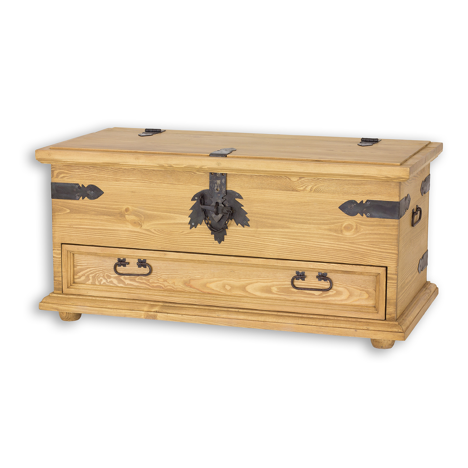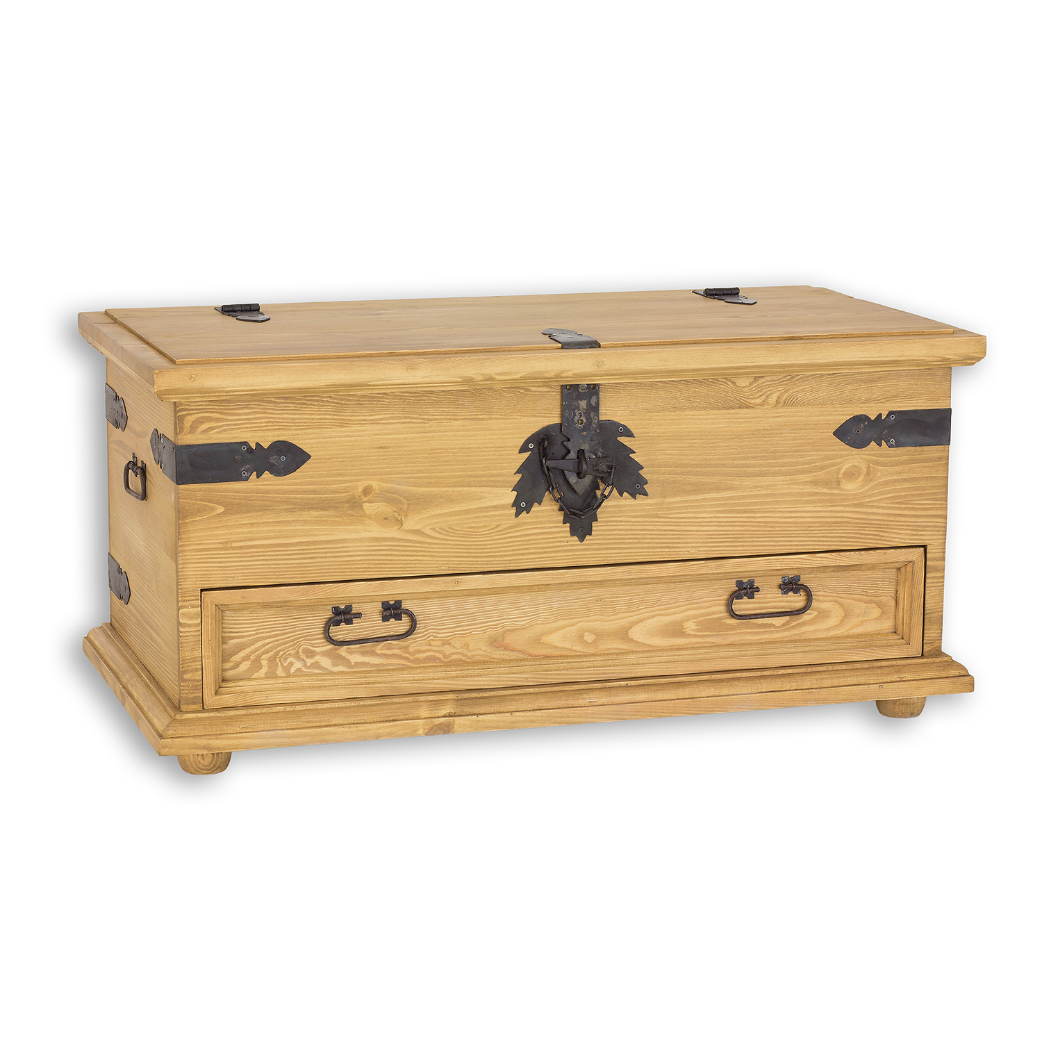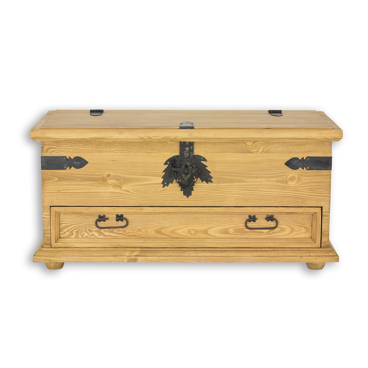 • Truhla je dokonalým doplňkem a ozdobou každého domova. Navržena v rustikálním stylu, vyrobena výhradně z masivního borovicového dřeva. V ložnici poskytne další úložný prostor pro polštáře a přikrývky, v předsíni poslouží jako sedátko při obouvání a v obývacím pokoji snadno nahradí konferenční stolek. Stabilní a praktická, stojící na dřevěných kulatých nohách. Má odolné víko, které se otevírá na jednu stranu a jednu zásuvku, která se vysouvá na dřevěnýcvýsuvech. K výrobě byly použity ručně vyrobené kovové panty a madla se starožitným efektem. Truhla dodá každému interiéru jedinečnou atmosféru. Povrch nábytku je ošetřen přírodním včelím voskem, který chrání povrch proti vlhkosti a zároveň pečuje o dřevo. Díky vosku je zvýrazněna přirozená struktura dřeva. Dodáváme smontované, rozměry 100x48x50cm.