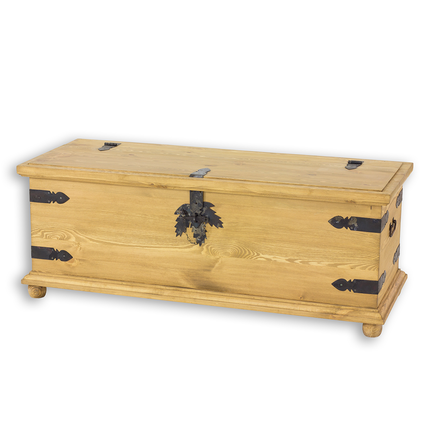 Truhla je dokonalým doplňkem a ozdobou každého domova. Navržena v rustikálním stylu , vyrobena výhradně z masivního borovicového dřeva. V ložnici poskytne další úložný prostor pro polštáře a přikrývky, v předsíni poslouží jako sedátko při obouvání a v obývacím pokoji snadno nahradí konferenční stolek. Stabilní a praktická, stojící na dřevěných kulatých nohách. Má jedno odolné víko, které se otevírá pouze jedním směrem. K výrobě byly použity ručně vyrobené kovové panty a madla se starožitným efektem. Truhla dodá každému interiéru jedinečnou atmosféru. Povrch nábytku je ošetřen přírodním včelím voskem, který vytváří ochrannou vrstvu proti vlhkosti a zároveň pečuje o dřevo. Díky vosku je zvýrazněna přirozená struktura dřeva. Dodáváme smontované, rozměry 126x48x50cm.