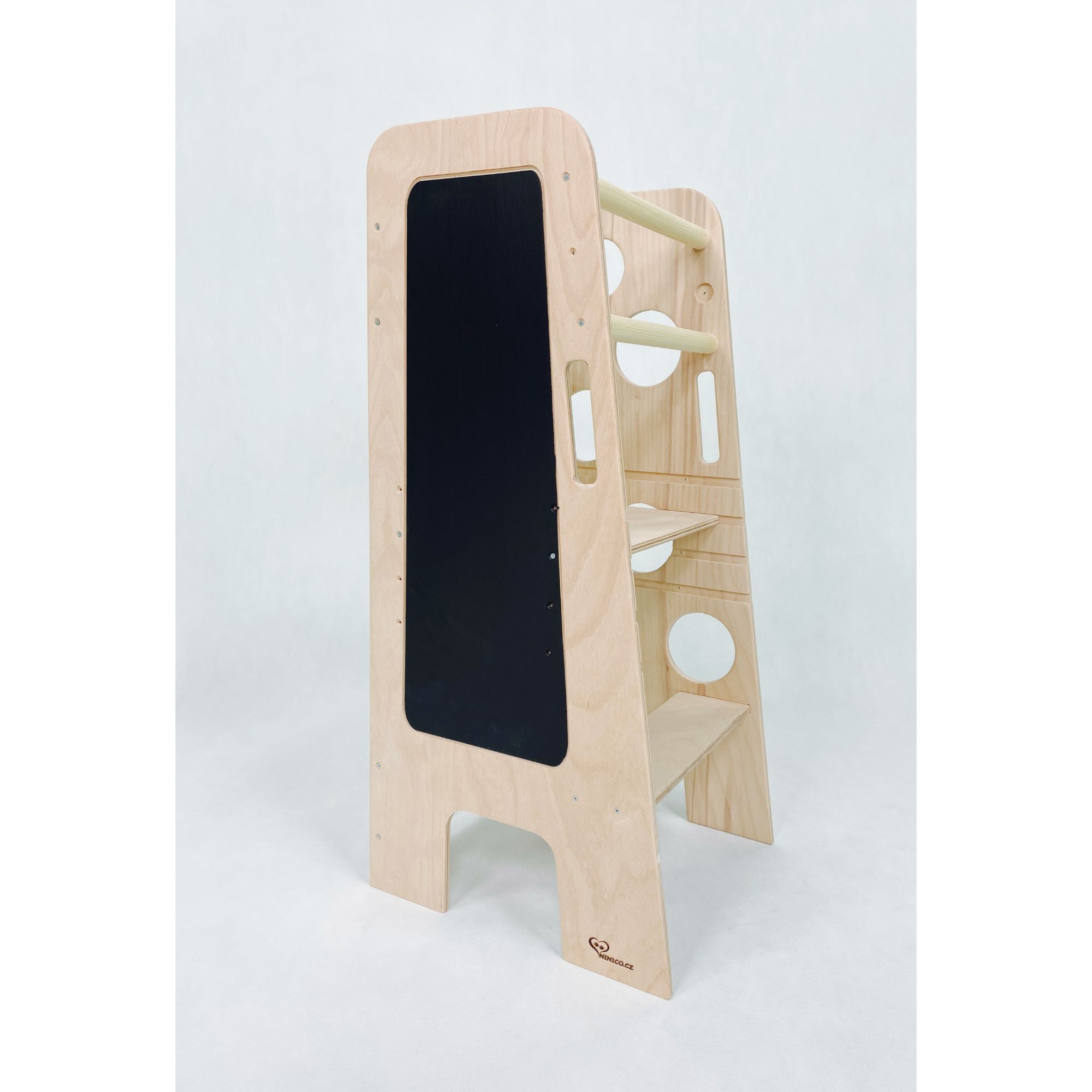 Vyrobeno z ekologicky nezávadného materiálu, buková překližka 15 mm. Pevná a stabilní konstrukce. Z boku věže kreslící tabulka na křídy. Zádové tyčky lze v pozdějším věku odstranit a dítě tak nemusí nic podlézat. Nastavitelný stupínek (hlavní podesta) lze nastavit na 35cm, 40cm a 45cm.