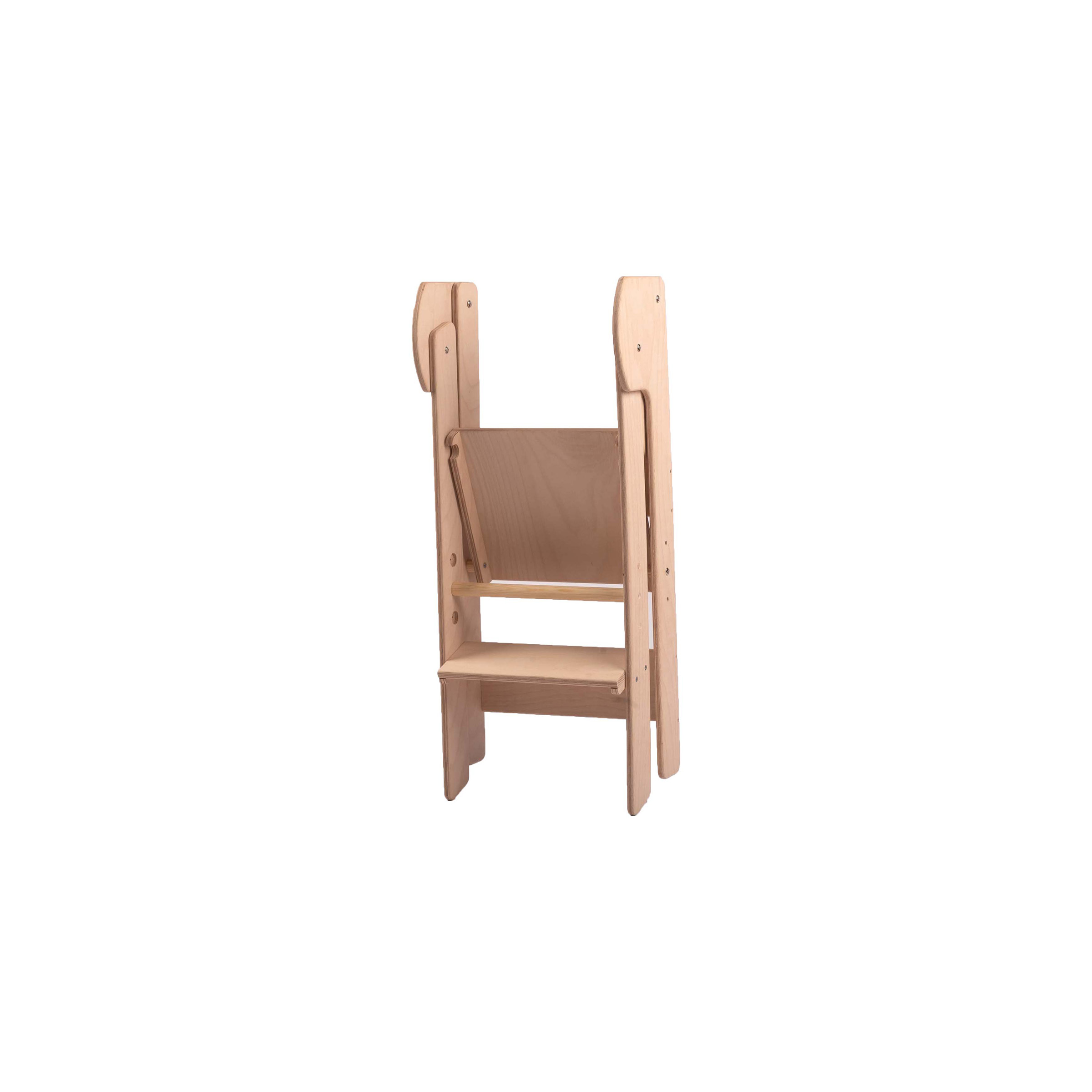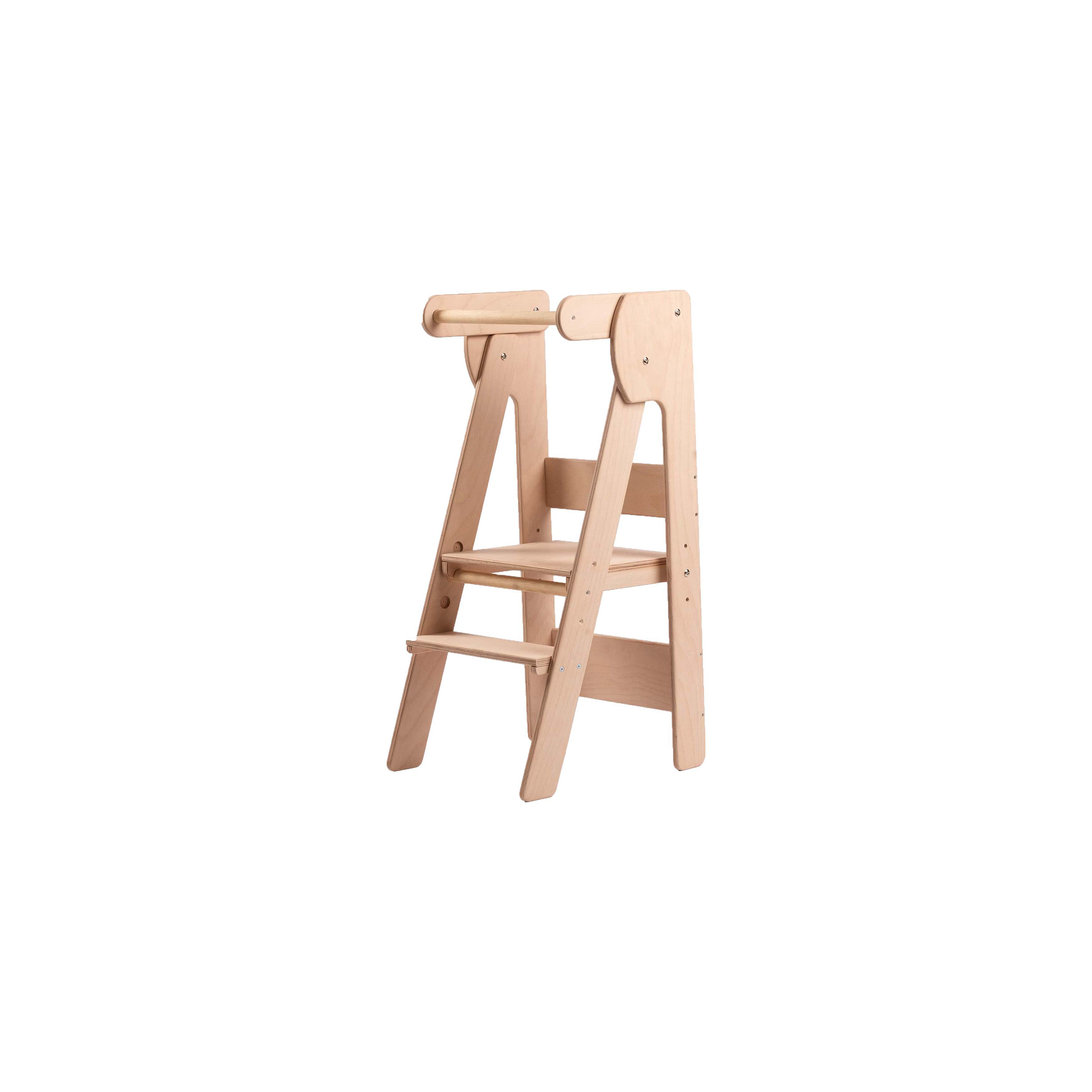 Vyrobeno z ekologicky nezávadného materiálu, buková překližka 15 mm. Pevná a stabilní konstrukce. Zádové tyčky lze v pozdějším věku odstranit a dítě tak nemusí nic podlézat. Nastavitelný stupínek (hlavní podesta) lze nastavit na 35cm, 40cm a 45cm.