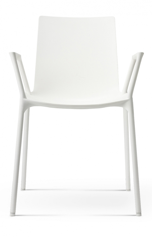• Návrh židle sjednocuje zdánlivě protichůdné vlastnosti – na jedné straně jemný a citlivý zjev, na druhé straně odolná robustní konstrukce. Lícní stranu umělohmotné skořepiny charakterizuje jasná, plynulá kontura – nepřerušovaná a klidná. Nohy vypadají, jako by vyrůstaly přímo ze spodní strany skořepiny. Tloušťka umělohmotné skořepiny se od okraje směrem ke středu sedací polohy zvětšuje. Vzniká tak stabilizující kříž, který zaručuje nezbytnou nosnost. Nohy z lakovaných trubek jsou se sedací skořepinou sešroubovány jednotlivě. Podnož je z precizních ocelových trubek, navíc s hluk tlumícími univerzálními kluzáky z umělé hmoty pro tvrdé i měkké povrchy. Židle má područky, které jsou již zahrnuty v ceně.