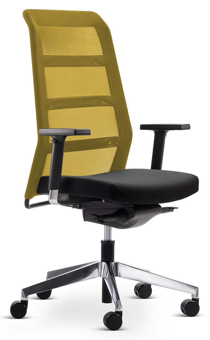 Nejoblíbenější kancelářská židle v historii Wiesner-Hager. Výškově nastavitelné opěradlo pro celoplošnou ergonomickou oporu zad, žlutá síťovina. Nastavení hloubky a výšky sedáku. Synchronní mechanika s bočním nastavením pružinové síly (40 - 120kg), stavitelná ve více pozicích. Hliníkový otočný kříž. Cena včetně výškově stavitelných područek s plastovým nosníkem. Vybírat můžete z různých barevných provedení.