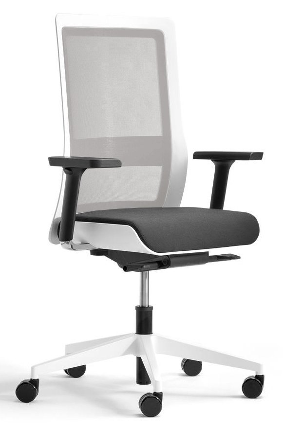 Elegantní plášť, pohodlné sezení, nadčasový design. Sedák čalouněný, opěrák z šedé síťoviny. Bílá barva plastu, bílý otočný kříž. Výškově stavitelné područky. Synchronní mechanismus, pružinový mechanismus s rychlou reakcí, nastavení hloubky sedáku, široká variabilita výškového nastavení. Stavitelná bederní opěrka. Vybírat můžete z různých variant potahových látek.