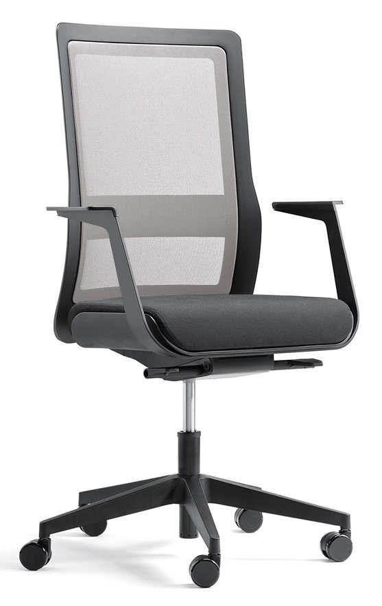 Elegantní plášť, pohodlné sezení, nadčasový design. Sedák čalouněný, opěrák z pastělově šedé síťoviny. Černá barva plastu, černý otočný kříž. Konferenční, nenastavitelné područky. Synchronní mechanismus, pružinový mechanismus s rychlou reakcí, nastavení hloubky sedáku, široká variabilita výškového nastavení. Stavitelná bederní opěrka. Vybírat můžete z různých variant potahových látek.